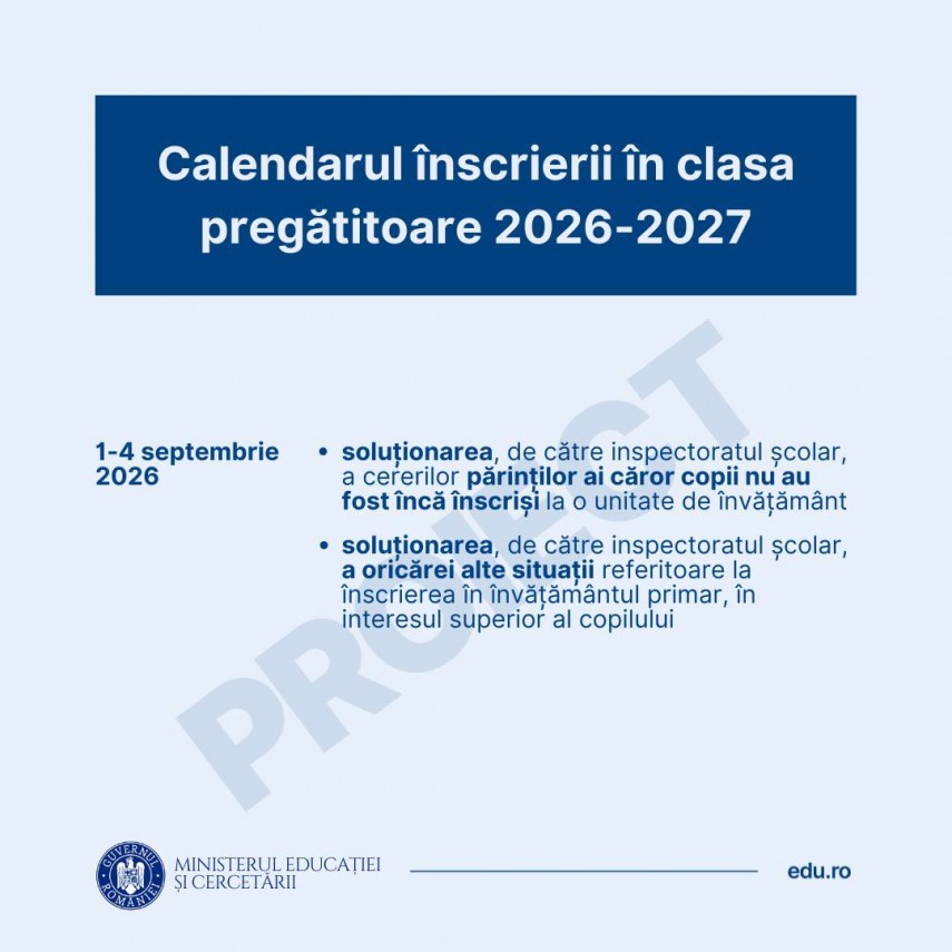 Am lansat în consultare publică proiectul de calendar pentru înscrierea în clasa pregătitoare în anul școlar 2026 - 2027. Părinții ai căror copii împlinesc 6 ani până la data de 31 august 2026 inclusiv au obligația de a înscrie copiii în clasa pregătitoare.