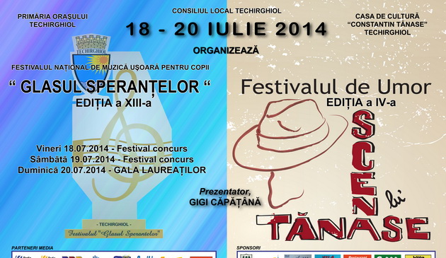 Primarul oraşului Techirghiol, Adrian Stan, invită toţi iubitorii de muzică uşoară şi de umor la două evenimente culturale importante. Este vorba despre cea de-a XIII-a ediție a Festivalului Național de Muzică Ușoară pentru Copii şi Tineret „Glasul Speranțelor“ şi despre ediţia a IV-a a Festivalului Naţional de Umor „Scena lu' Tănase“. Ambele se vor desfăşura în perioada 18 - 20 iulie, începând cu ora 19.00.Pe scena Teatrului de Vară „Jean Constantin“ vor evolua 45 de copii din toate zonele țării, care vor încerca să impresioneze prin calitățile lor artistice juriul format din personalități marcante ale muzicii ușoare românești, avându-l ca președinte pe binecunoscutul compozitor Viorel Gavrilă.