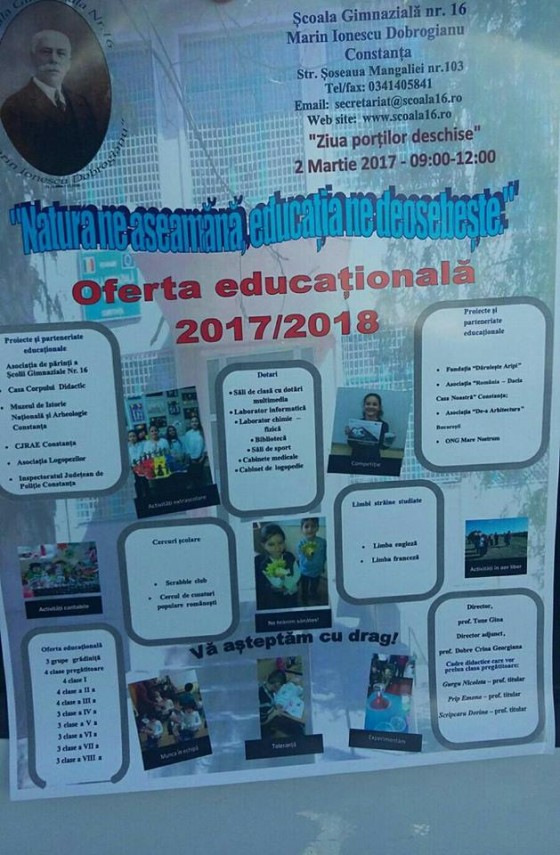 Azi, între orele 9.00-12.00, Şcoala Gimnazială nr. 16 Marin Ionescu Dobrogianu organizează eenimentul Ziua Porților Deschise. Copii şi părinţii sunt aşteptaţi pentru a primi informaţii utile. De asemenea, se pot completa cereri pemtru înscrierea în clasa pregatitoare pentru anul şcolar 2017-2018.Iată oferta educaţională a unităţii şcolare: trei grupe de grădiniţă, patru clase pregătitoare, patru clase I-a, patru clase a II-a, patru clase a III-a, trei clase a IV-a, trei clase a V-a, trei clase a VI-a, trei clase a VII-a şi trei clase a VIII-a.