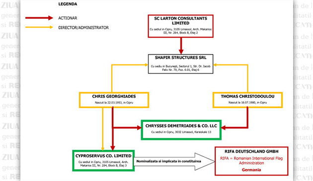Cei doi ciprioți aduși în Shapir, Chris Georghiades și Thomas Christodoulou, sunt avocați de renume ai firmei cipriote Chrysses Demetriades, casa de avocatură prin intermediul căreia cetățenii germani Albrecht Gundermann, Stefan Schmidt-Ammon, Bernard Heiss, Kirch Thomas, Kofler Georg, Bernt Gienskey şi Jörg Molzahn au încercat preluarea pavilionului român și înființarea unui registru naval privat, controlat de o companie off shore din Cipru. Nemții ar fi fost susținuți de Valeriu Preda, fost secretar de stat în Ministerul Transporturilor în guvernul Ponta 1 și fost consilier al primarului Radu Ștefan Mazăre. Ei au reușit să încheie un contract cu Autoritatea Navală Română prin care să-i preia acesteia mare parte din atribuțiuni, cu toate că legislația română nu permite acest lucru. Compania nemților din România se numește Romanian International Flag Administration SA, prescurtat - RIFA SA, și își are originile tot în Cipru via Germania. De fapt, nemții au înființat și o societate în Germania, care era controlată de un off shore din Cipru și care avea și o sucursală în România. Contractul cu RIFA SA conținea niște condiții păguboase pentru statul român și avea ca obiect înscrierea sub pavilion românesc a unor nave deținute de armatori nemți la niște taxe de zeci de ori mai scăzute decât în restul țărilor europene. Toate aceste taxe intrau în primii ani de contract direct în conturile RIFA SA. Firma din Cipru a nemților a fost înființată tot de cei doi avocați ciprioți, Chris Gheorghiades și Thomas Demetriades, care sunt prezenți ca administratori la începutul lui 2014 în Shapir. Chris Georghiades a reprezentat prin participație directă și administrare Casa de avocatură Chrysses Demetriades în cadrul firmei CyproServus Co. Limited din Cipru. Coincidență sau nu, CyproServus are sediul la aceeași adresa cu cel al sucursalei SC Larton Consultant Limited din Limassol, off shore ale cărui ștampile au fost găsite la sediul firmei Shapir din România. Ca să revenim, menționăm că CyproServus a fost nominalizată pentru înființarea RIFA LTD - RIFA DEUTSCHLAND GMBH.Afacerea „Pavilionul“ a făcut obiectul unei anchete DNA clasate în urma decesului lui Eugen Olteanu, directorul interimar al Autorității Navale Române care a semnat contractul cu Romanian Internatioanal Flag Administration SA România. Reamintim, de asemenea, ca Valentin Preda a fost susținătorul acestei afaceri păguboase pentru statul român care a eșuat după ce conducerea ANR a declinat contractul cu RIFA. Preda a fost cercetat de DNA alături de Emil Dan Manolachi, fost ofiţer de poliție judiciară în cadrul DNA. Polițistul i-ar fi transmis informații secrete din dosarele DNA lui Preda, iar beneficiarii se pare că erau membrii trioului Mazăre-Constantinescu-Strutinsky. În prezent, Valentin Preda este trimis în judecată și pentru luare de mită în același dosar.