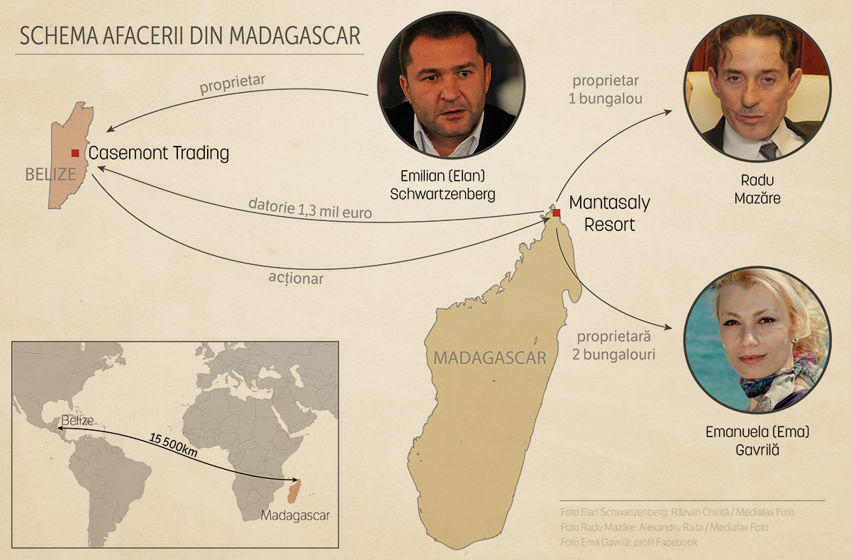 Casemont Trading Limited, firma lui Schwartzenberg din Belize, a preluat afacerea Madagascar, pe 22 mai 2013, în Israel. Afaceristul s-a întâlnit atunci cu frații Mazăre la un notariat din Tel Aviv ca să-și regleze situația financiară cu ei.