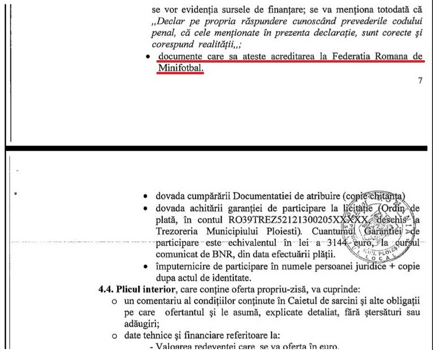 Prin documentația de atribuire, aferentă caietului de sarcini pentru concesionarea a terenului de 5.200 de mp, Primăria Ploiești le-a impus tuturor participanților la licitație respectarea unei condiții eliminatorii. Aceea de a fi „acreditați” de Federația de Minifotbal din România, condusă de Răzvan Burleanu.