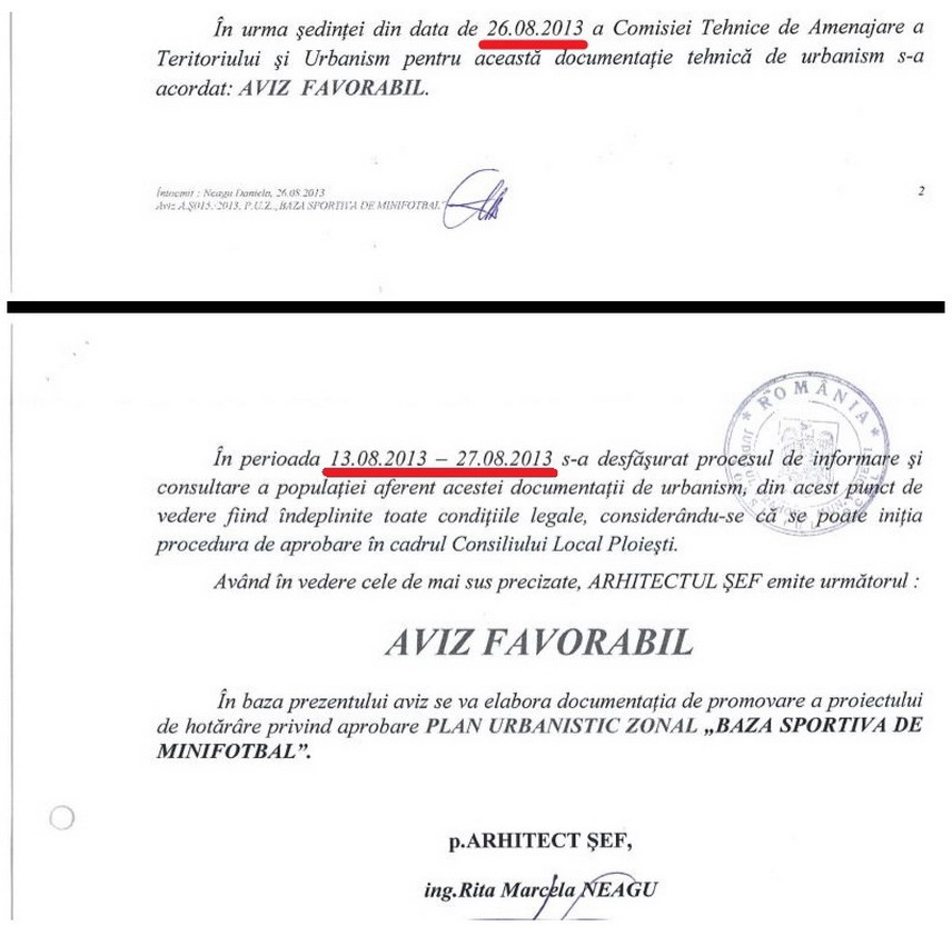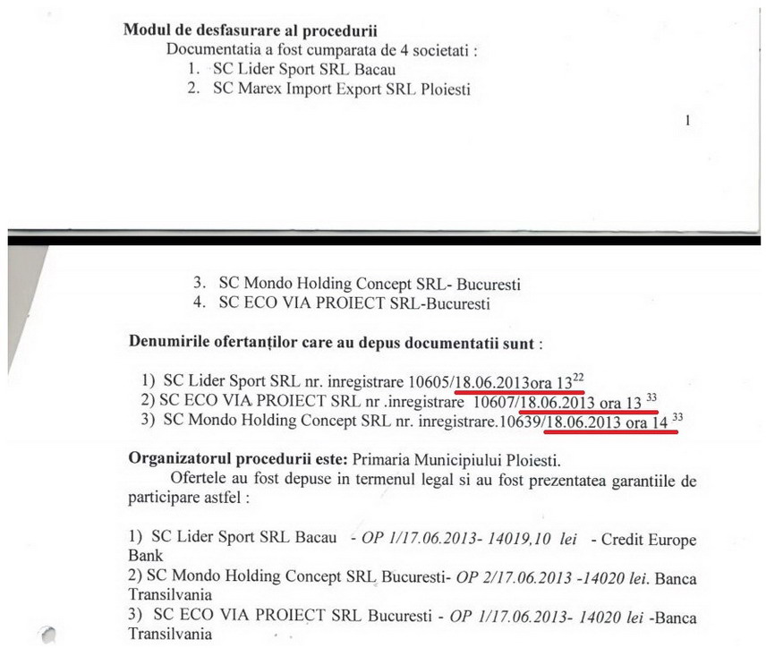 Dintre cele 22 de zile lucrătoare care există între aceste două date calendaristice, toate cele trei firme competitoare – Lider Sport, Mondo Holding Concept și Eco Via Proiect – au făcut drumul la Primăria Ploiești în aceeași zi: în după-amiază zilei de 18 iunie. (A doua zi, la ora 9 dimineața, perioada de depunere a ofertelor ar fi expirat.)