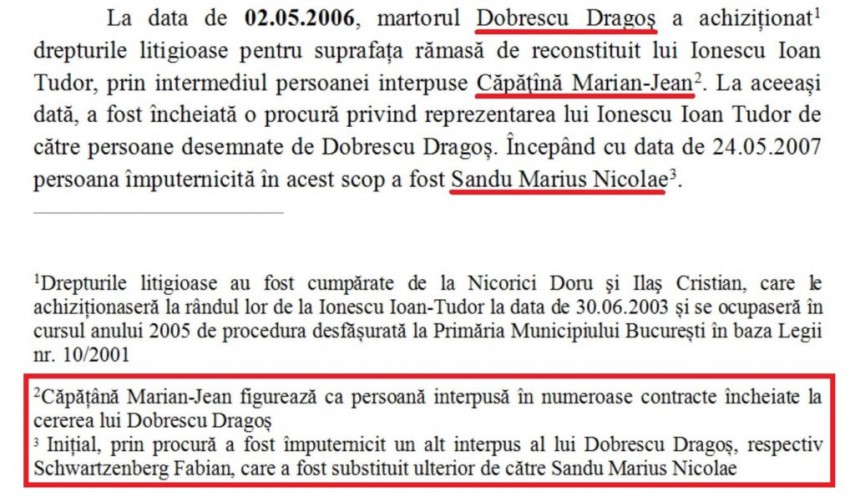 Imediat după restituire, la capătul unei tranzacții cu bani nevăzuți, „800.000 de euro”, terenul este înscris pe numele lui Marian-Jean Căpățînă – cel mai frecvent interpus al lui Dragoș Dobrescu.