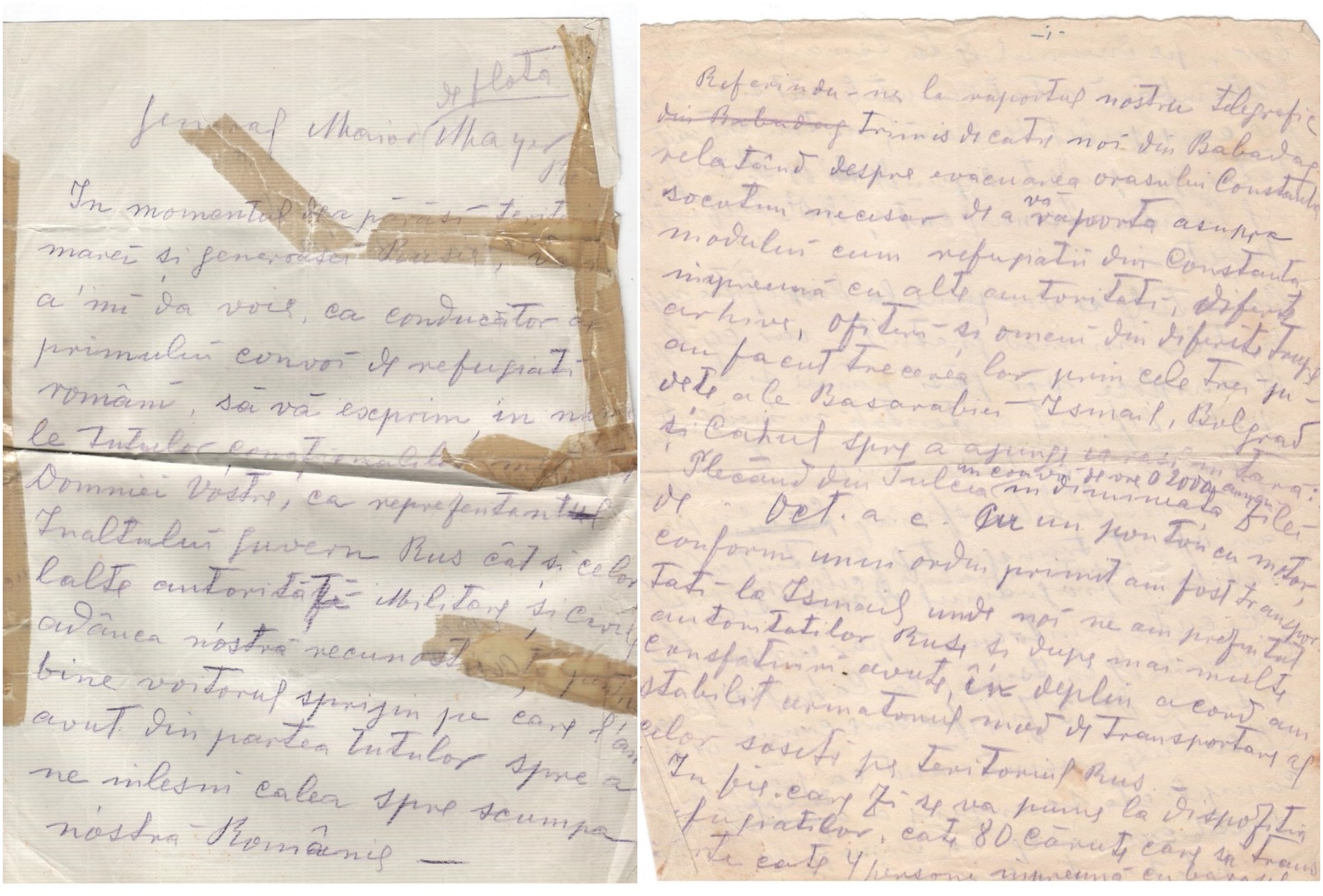 „Referindu-mă la raportul nostru trimis de către noi din Babadag relatând despre evacuarea oraşului Constanţa socotim necesar de a vă raporta asupra modului cum refugiaţii din Constanţa împreună cu alte autorităţi, diferite arhive, ofiţeri şi oameni din diferite trupe am făcut trecerea lor prin cele trei judeţe ale Basarabiei - Ismail, Bolgrad şi Cahul spre a ajunge astfel în ţară.