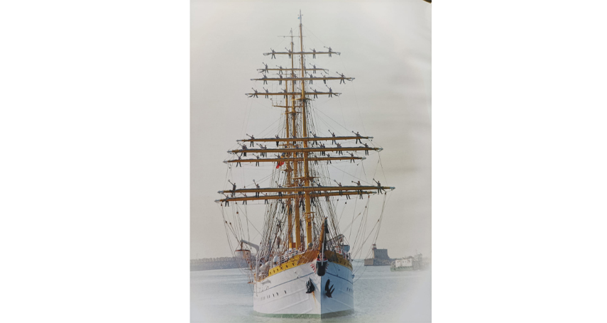 Să revenim la însemnările din Jurnalul de bord: „12.47 – a început manevra de strângere a velelor triunghiulare; 12.52 – …echipajul coboară de pe vergi şi stă la front pe ambele borduri”.