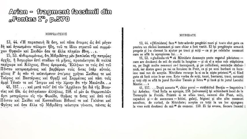 Aceeași sursă ne spune clar că de partea lui Mitrhidates se află și grecii din cetățile nord și vest-pontice, pe care el a știut să și-i câștige ca aliați. Arian insistă asupra calităților regelui, care știe să își atragă armate prietene: "Mitridate domnește peste regatul părintesc.... dar el a adus sub stăpânirea sa, pe lângă multe alte neamuri care îl înconjoară, și pe colchidieni, seminție războinică, iar dintre greci - pe cei care locuiesc la Pont, ca și pe acei barbari care locuiesc mai sus de aceștia (n.a. geți, sciți). Mitridate le cere sprijin acestora ca unor prieteni, ei fiind gata să facă orice el le-ar cere. E vorba de sciți, tauri, bastarni, traci, sarmați și toți câți se află în jurul fluviilor Tanais (n.a. azi Don) și Istru, și încă și în jurul Lacului Meotic (n.a. azi Marea Azov).