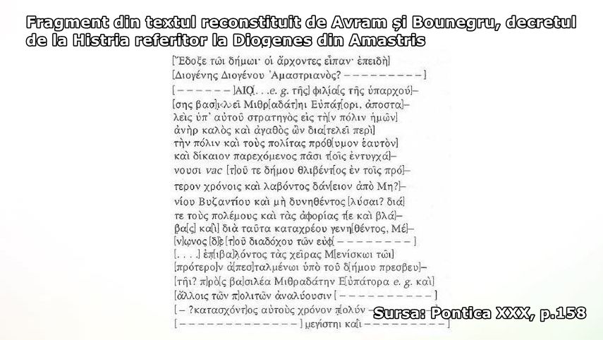 Iată ce ne spune la început decretul histrian: "Poporul a găsit cu cale. Arhonții au propus. Întrucât Diogenes, fiul lui Diogenes din Amastris (n.a. azi Amastra, în nordul Turciei)... amiciția existentă față de regele Mithridate Eupator, trimis fiind de către acesta (n.a.de către Mithridates) strateg în cetatea noastră, a continuat să se comporte ca un bărbat ales și vrednic și să se arate plin de râvnă și de dreptate față de toți cei cărora li se întâmplă să aibă nevoie de serviciile sale.