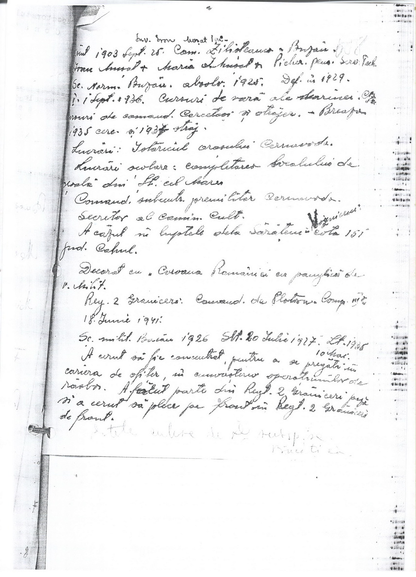 IV. Educație militară f. frumoasă. Cuminte, educat, modest. Îi place mult cariera armelor, cerând să rămână concentrat aproape tot anul. Talentat. Cântă bine. Priceput în organizarea serbărilor. Bun patriot. Îndrăsneț.