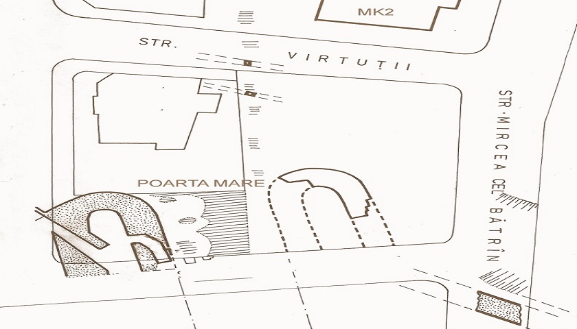 Între str. Dragoș Vodă și b-dul Republicii (astăzi - Ferdinand) urma să se construiască un șir de blocuri de locuințe cu spații comerciale la parter. Mai precis, în apropierea str. Dragoș Vodă trebuia să se construiască blocul MK2 cu un regim de înălțime P+7-8 etaje, format din două tronsoane (șef de proiect arh. Mihai Isacov). După demolări, la săpăturile pentru fundațiile blocului, s-au descoperit și rămășițele turnului dinspre mare ale Porții Mari și continuarea înspre mare a zidului de incintă. În urma unei ședințe comune la care au participat reprezentanții Primăriei Constanța, arhitecții Institutului Județean de Proiectare, arheologi și istorici, s-a luat atunci hotărârea de punere în valoare a întregii porți, ca urmare - să nu se mai facă tronsonul 2 al blocului și să se modifice terminația tronsonului 1 (care ar fi avut calcan la rost față de tronsonul 2), proiectul modificându-se, partea dinspre sud a scării B având acum ferestre și balcoane, fiind cap de perspectivă.