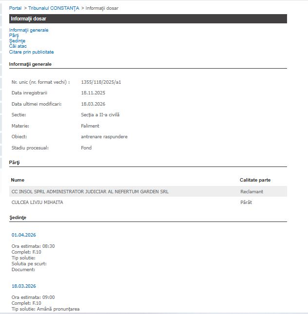 Justiție Constanța Administratorul Nefertum Garden SRL, dat în judecată pentru antrenarea răspunderii după intrarea firmei în insolvență