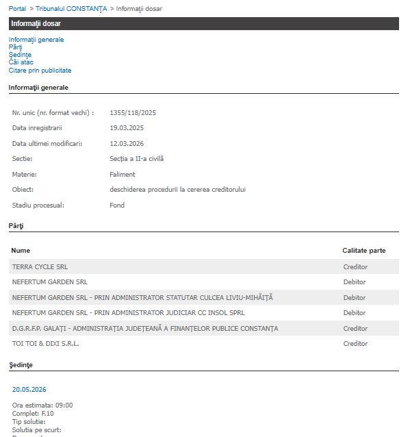 Problemele juridice ale societății au început în primăvara anului 2025, când creditorul Terra Cycle SRL a solicitat deschiderea procedurii. Ulterior, pe lista creditorilor s-au înscris și DGRFP Galați (AJFP Constanța), precum și compania Toi Toi & Dixi SRL.