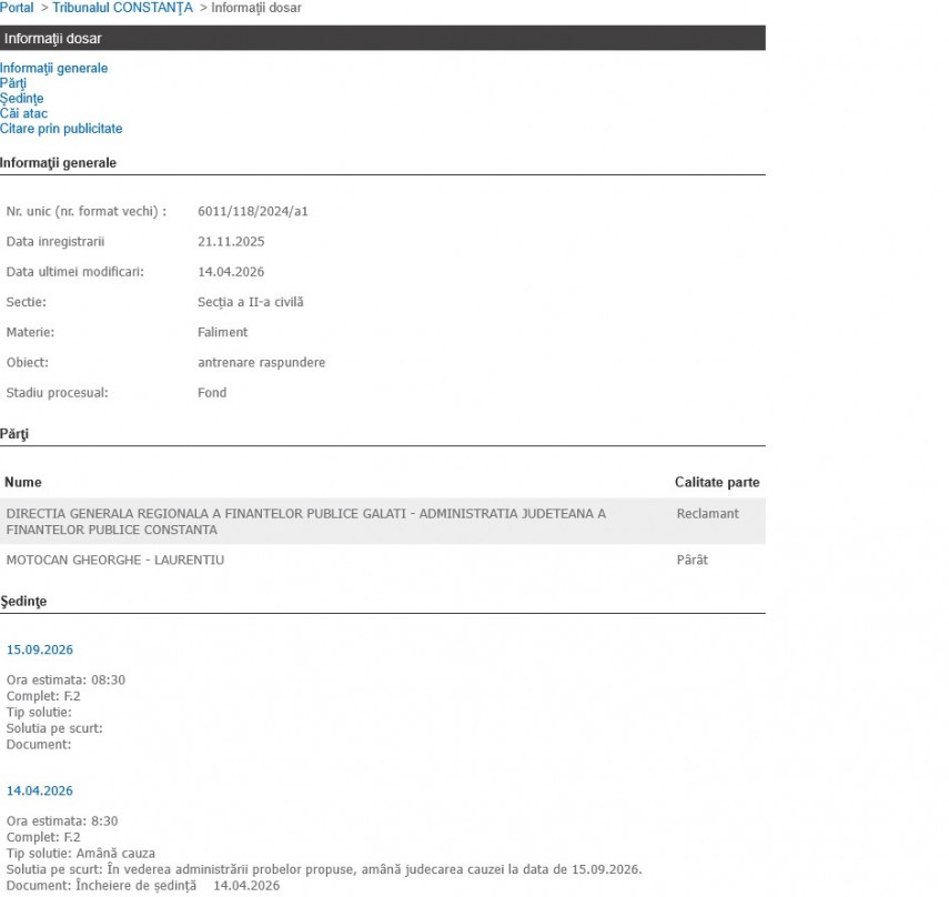 La termenul de astăzi, Tribunalul a amânat pentru 15 septembrie a.c. procesul intentat de ANAF împotriva lui Moțocan Gheorghe-Laurențiu, administratorul Detectors Family Alarm SRL, al cărui obiect este „antrenare răspundere”.