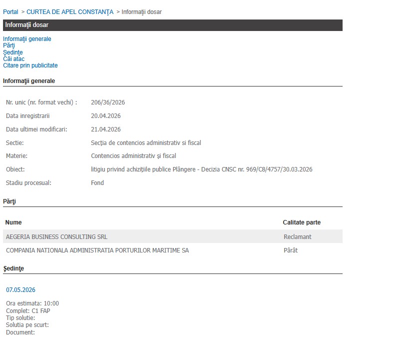 La data de 20.04.2026, la Curtea de Apel Constanța, a fost înregistrat dosarul cu nr. 206/36/2026, în care Compania Națională Administratia Porturilor Maritime SA Constanța este pârât, iar Aegeria Business Consulting SRL este reclamant. Obiectul dosarului îl constituie „ litigiu privind achiziţiile publice Plângere - Decizia CNSC nr. 969/C8/4757/30.03.2026”, ceea ce înseamnă că firma reclamantă contestă în instanță o decizie dată de CNSC într-o procedură de achiziție publică.