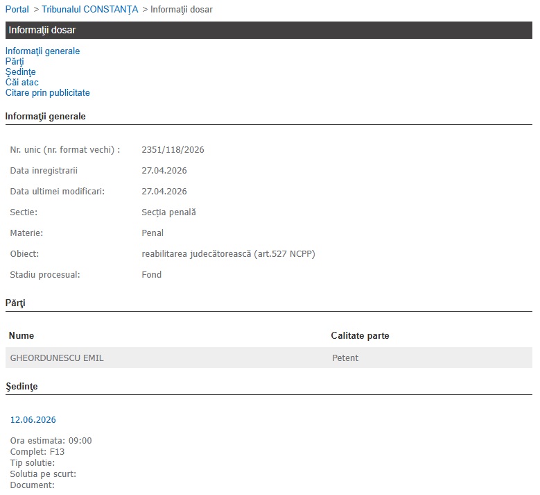 Conform datelor oficiale publicate pe portalul instanțelor, dosarul cu numărul 2351/118/2026 a fost constituit în data de 27 aprilie 2026, având ca obiect „reabilitarea judecătorească” în temeiul articolului 527 din Noul Cod de Procedură Penală.