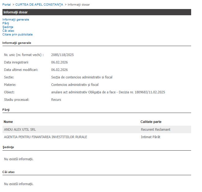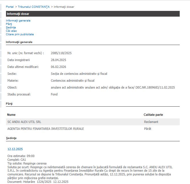 O nouă bătălie juridică pe frontul fondurilor europene și rurale a izbucnit la începutul acestui an. Firma Andu Alex Util SRL a chemat în judecată Agenția pentru Finanțarea Investițiilor Rurale (AFIR), în dosarul 2085/118/2025, înregistrat pe rolul Secției de Contencios Administrativ și Fiscal.