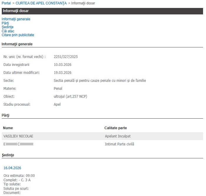 Nemulțumit fiind de decizia instanței de fond, Vasiliev Nicolae a formulat o contestație care a fost înaintată spre soluționare Curții de Apel Constanța, instanță care, potrivit Portalului Instanțelor de Judecată, a stabilit termen de judecată la jumătatea lunii aprilie, anul curent.