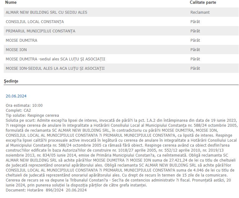 „Admite excepția lipsei de interes, invocată de pârâț la pct. I.A.2 din întâmpinarea din data de 19 iunie 2023, și respinge cererea de anulare în integralitate a Hotărârii Consiliului Local al Municipiului Constanţa nr. 588/24 octombrie 2005, formulată de reclamanta SC Almar New Building SRL, în contradictoriu cu pârâții Moise Dumitra, Moise Ion, Consiliul Local al Municipiului Constanța și Primarul Municipiului Constanța, ca lipsită de interes. Respinge excepția lipsei calității procesuale active invocată în legătură cu cererea de anulare în integralitate a Hotărârii Consiliului Local al Municipiului Constanţa nr. 588/24 octombrie 2005 ca rămasă fără obiect. Respinge cererea având ca obiect desființarea construcțiilor edificate în baza Autorizațiilor de construire nr. 1018/27 aprilie 2005, nr. 552/12 aprilie 2010, nr. 2019/13 noiembrie 2013, nr. 834/05 iunie 2014, emise de Primăria Municipiului Constanța, ca neîntemeiată. Obligă reclamanta SC Almar New Building SRL să achite pârâților Moise Dumitra și Moise Ion suma de 27.421,24 de lei cu titlu de cheltuieli de judecată reprezentând onorariul apărătorului ales. Obligă reclamanta SC Almar New Building SRL să achite pârâților Consiliul Local al Municipiului Constanța și Primarul Municipiului Constanța suma de 4.046 de lei cu titlu de cheltuieli de judecată reprezentând onorariul apărătorului ales. Cu drept de recurs în termen de 15 zile de la comunicare. Cererea de recurs se va depune la Tribunalul Constanța - Secția de contencios administrativ și fiscal. Pronunţată pe 20 iunie 2024, prin punerea soluţiei la dispoziţia părţilor de către grefa instanţei. Document: Hotarâre 20.06.2024“, se spune în soluția pe scurt.