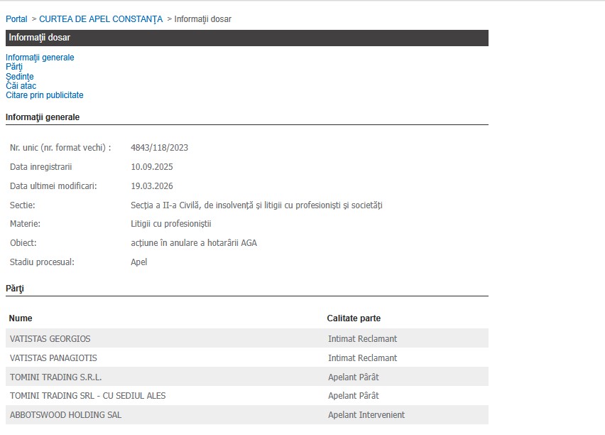 Potrivit Portalului Instanțelor de Judecată, părți în dosar sunt Vatistas Georgios și Vatistas Panagiotis, în calitate de intimat reclamanți, Tomini Trading SRL, în calitate de apelant pârât și Abbotswood Holding SAL, în calitate de apelant intervenient.