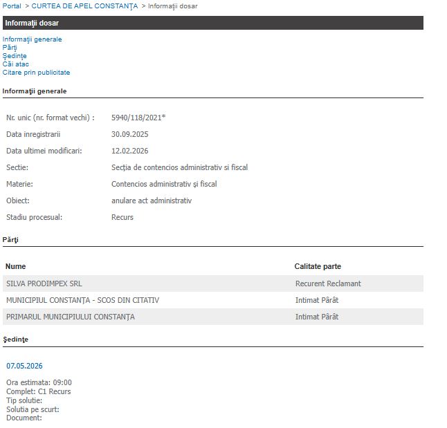 Curtea de Apel Constanța a decis astăzi, 12 februarie 2026, amânarea judecării dosarului în care societatea Silva Prodimpex SRL solicită anularea unui act administrativ emis de autoritățile locale.