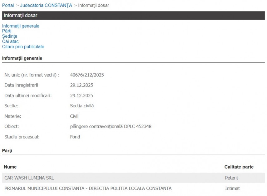 Dosarul cu nr. 40676/212/2025 a fost înregistrat pe data de 29.12.2025 pe rolul Judecătoriei Constanța, se află pe secția civilă, având ca obiect „plângere contravenţională DPLC 452348 ”. Stadiul procesual este pe fond.