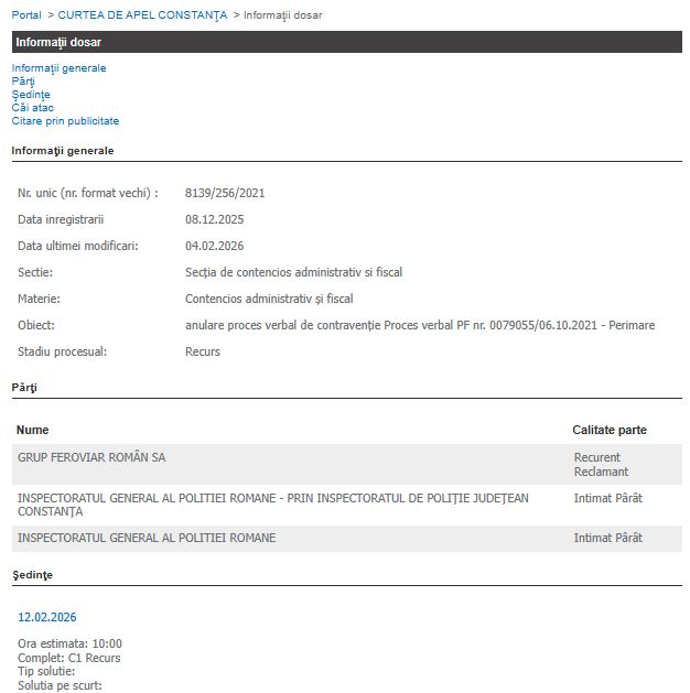 Astfel, dosarul 8139/256/2021 a ajuns la Curtea de Apel Constanța, unde Grup Feroviar Român SA figurează ca recurent, iar Inspectoratul General al Poliției Române și Inspectoratul de Poliție Județean Constanța ca pârâți. În prezent, litigiul se află în faza recursului, după ce instanța inferioară a constatat că apelul a expirat.