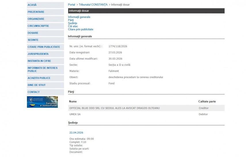 La data de 27.03.2026, pe rolul Secției a II-a Civilă a Tribunalului Constanța, a fost înregistrat dosarul nr. 1774/118/2026. Obiectul acestuia este „deschiderea procedurii la cererea creditorului”, iar entitatea vizată este societatea Umex SA.