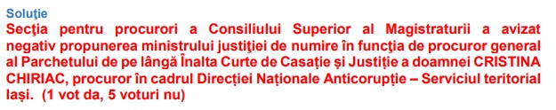 Aviz negativ din partea CSM privind propunerea de numire a Cristinei Chiriac în funcţia de procuror general!