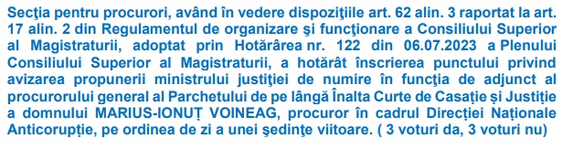În aceeași zi, în cadrul ședinței Secției pentru Procurori, CSM a hotărât ca într-o şedinţă viitoare să fie analizată propunerea ministrului justiţiei de numire în funcţia de adjunct al procurorului general al Parchetului de pe lângă Înalta Curte de Casație și Justiție a magistratului Marius-Ionuț Voineag, procuror în cadrul Direcției Naționale Anticorupție.