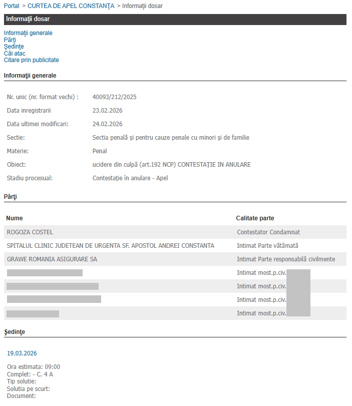 Mai precis, la 18 zile de când Curtea de Apel Constanța i-a respins ca inadmisibilă contestaţia în anulare formulată de condamnatul Rogoza Costel, luni, 23 februarie 2025, pe Secția penală şi pentru cauze penale cu minori şi de familie a fost înregistrată o nouă contestație în anulare!