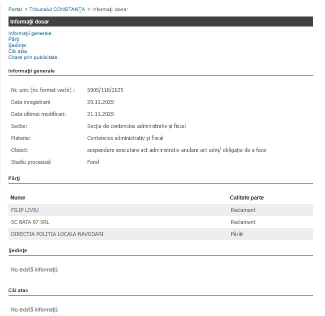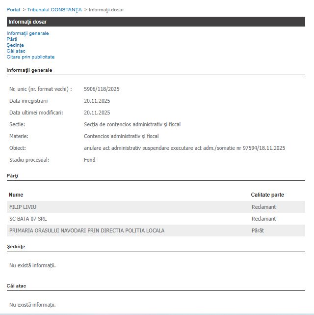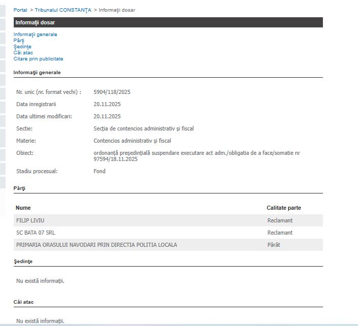 Dosarele, toate înregistrate pe 20 noiembrie 2025, au ca reclamanți pe Filip Liviu și SC Bata 07 SRL, iar pârât este Primăria Orașului Năvodari prin Direcția Poliția Locală sau Direcția Poliția Locală Năvodari. Este vorba despre dosarele cu numerele 5906/118/2025, 5905/118/2025, 5904/118/2025.
