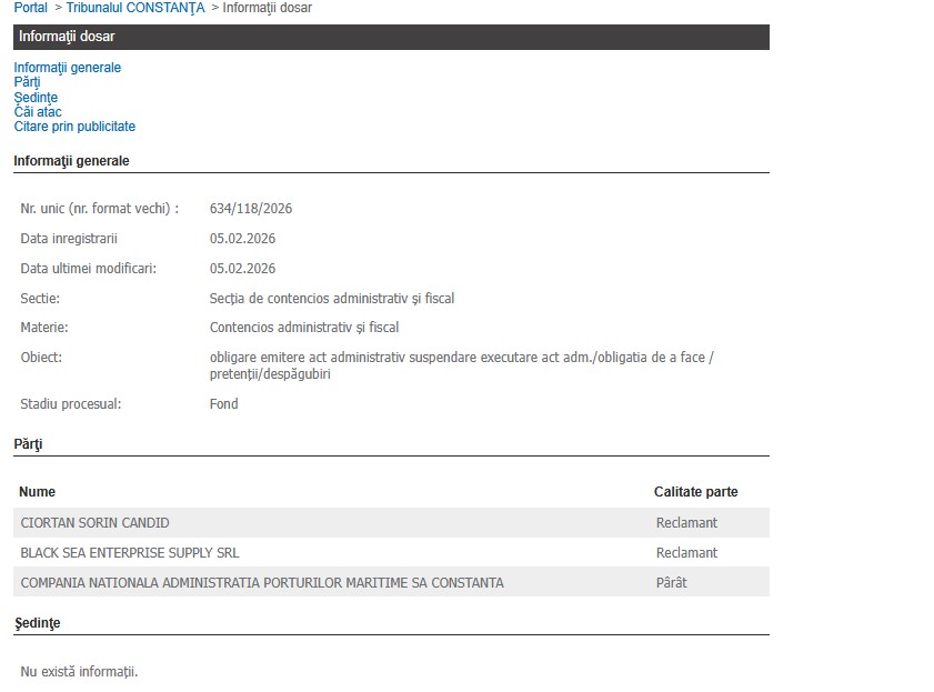 Părți în dosar sunt Black Sea Enterprise Supply SRL, prin asociatul unic al firmei Ciortan Sorin Candid, în calitate de reclamant și Compania Națională Administrația Porturilor Maritime SA Constanța, în calitate de pârât.