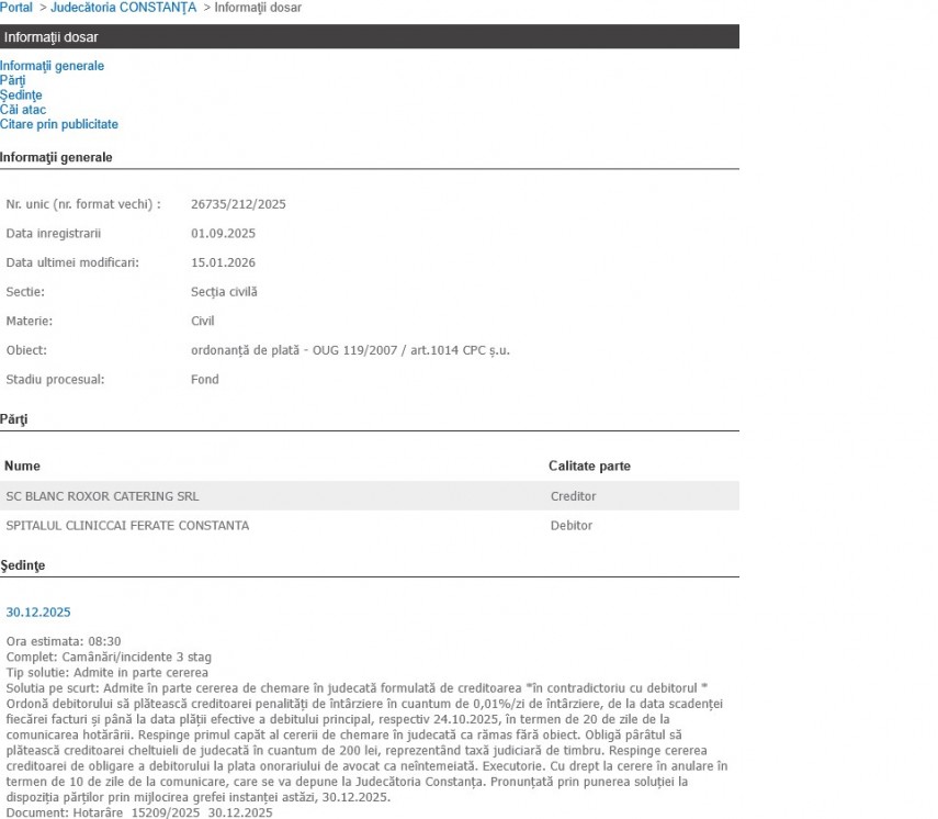 - În data de 30 decembrie 2025, Judecătoria Constanța a luat o decizie în privința procesului intentat de firma Blanc Roxor Catering SRL împotriva Spitalului Clinic Căi Ferate Constanța