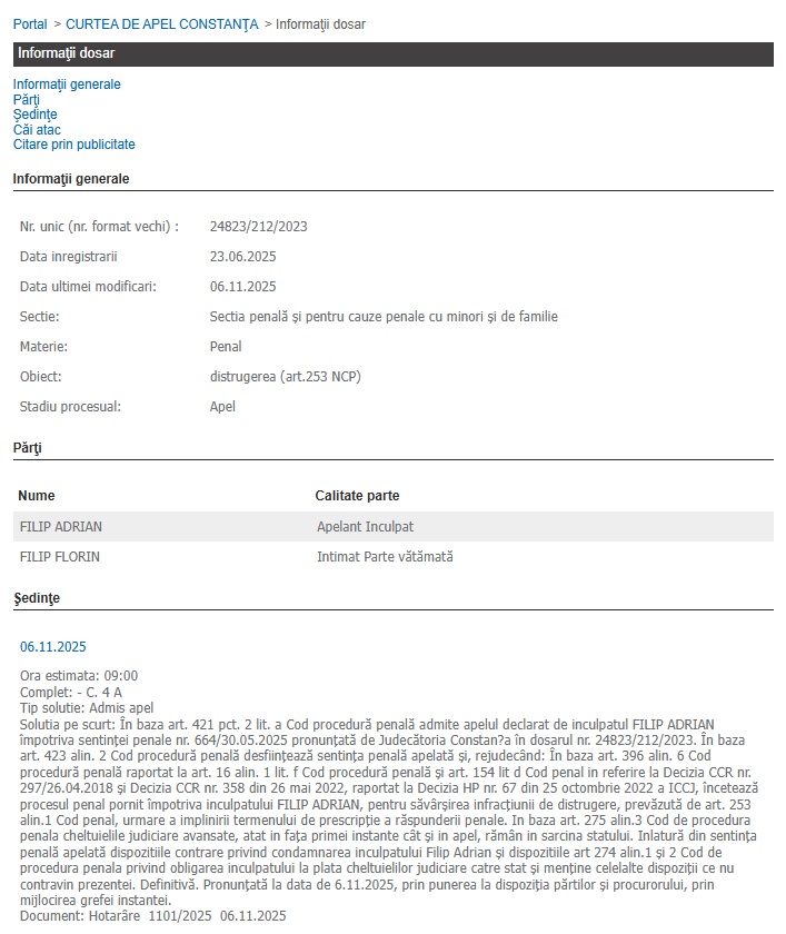 Soluția a fost contestată de către inculpat, iar cauza a fost trimisă spre soluționare Curții de Apel Constanța, care joi, 06.11.2025, a anunțat că a admis apelul. Mai precis, instanța superioară a hotărât încetarea procesului penal pornit împotriva inculpatului, ca urmare a implinirii termenului de prescripţie a răspunderii penale.