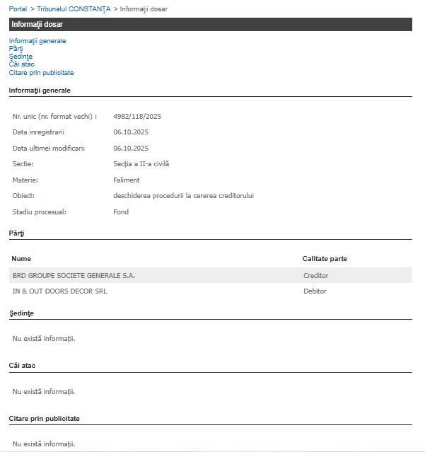BRD Groupe Societe Generale SA cere intrarea în faliment a In & Out Doors Decor SRL din Constanța