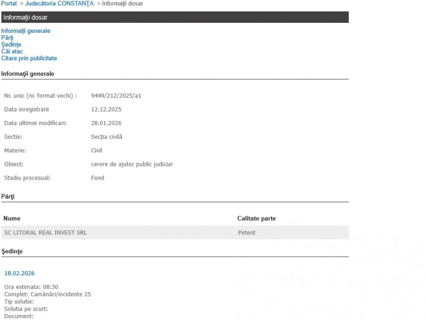 Disputa juridică a fost înregistrată pe rolul Judecătoriei Constanța în data de 2 aprilie 2025 și după amânarea din 18 noiembrie, următorul termen este stabilit pentru 21 aprilie a.c.
