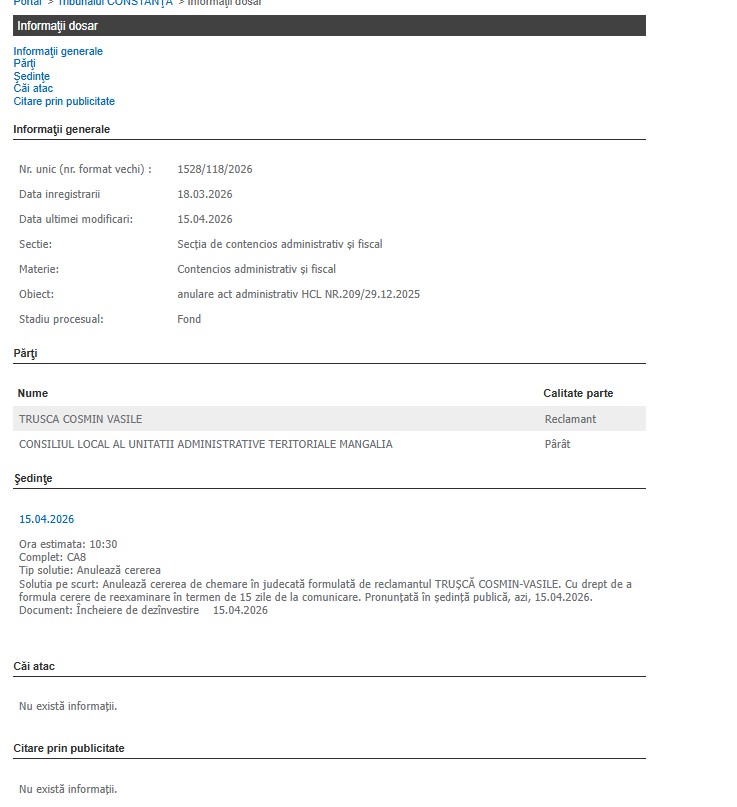 Dosarul, înregistrat inițial pe 18 martie 2026, viza anularea Hotărârii Consiliului Local (HCL) nr. 209 din 29 decembrie 2025. Fostul consilier local din partea partidului AUR, Cosmin Vasile Trușcă, în calitate de reclamant, dă în judecată Consiliul Local al UAT Mangalia, în calitate de pârât, unde cere suspendarea hotărârii prin care s-a luat act de demisia sa din CL Mangalia.