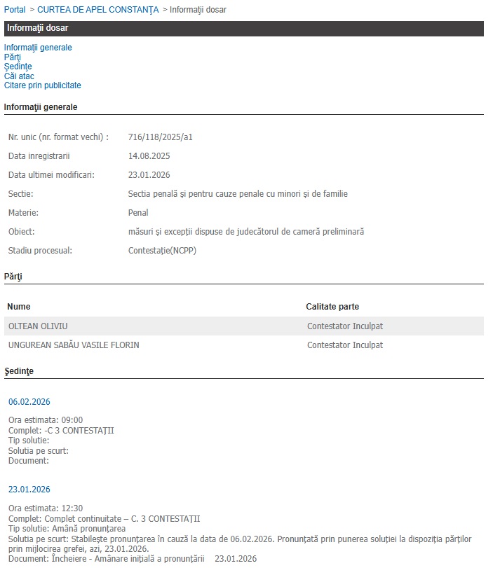 Cu privire la măsurile preventive, Curtea de Apel Constanța este așteptată ca luni, 26.01.2026, să anunțe dacă cei doi vor fi menținuți în stare de arest preventiv sau dacă vor fi dispuse măsuri mai blânde.