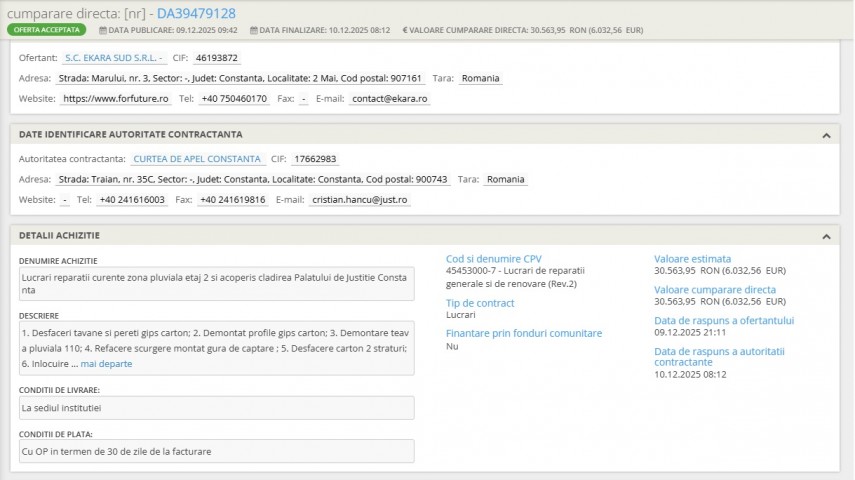 Curtea de Apel Constanța a atribuit un contract prin cumpărare directă privind lucrări reparații curente zona pluvială etaj 2 și acoperiș la clădirea Palatului de Justiție Constanța.