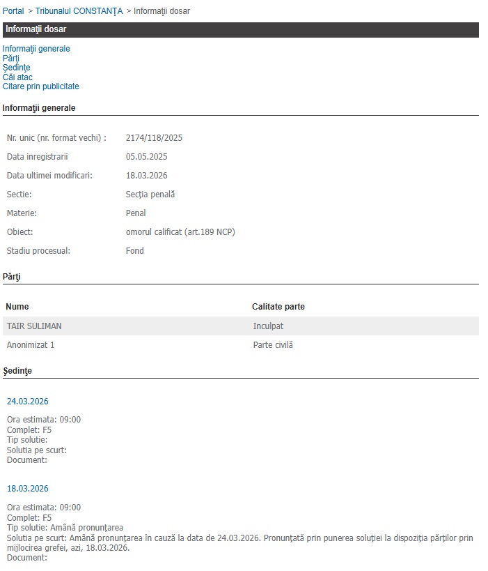 Un bărbat suspectat de comiterea unei crime își așteaptă astăzi, 24.03.2026, sentința la Tribunalul Constanța! În cauză, este vorba despre Tair Suliman suspectat de omor calificat și tâlhărie calificată!