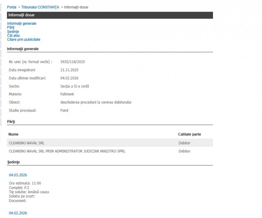 Astăzi,4 februarie 2026 a fost fixat termen de judecată la Tribunalul Constanța, unde se află dosarul cu nr. 5935/118/2025, înregistrat în data de 21.11.2025, având ca obiect deschiderea procedurii de insolvență la cererea debitorului, Cleaning Naval SRL.