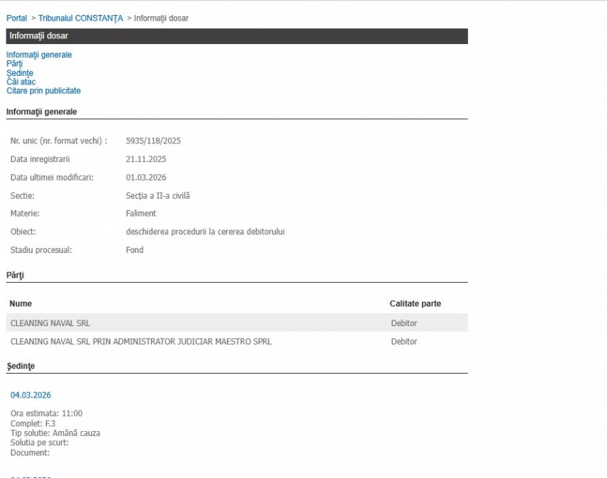 Astăzi, 4 martie 2026 este fixat termen de judecată la Tribunalul Constanța, unde se află dosarul cu nr. 5935/118/2025, înregistrat în data de 21.11.2025, având ca obiect deschiderea procedurii de insolvență la cererea debitorului, Cleaning Naval SRL.