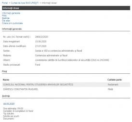 Dosarul are numărul 2800/2/2020 și se află în atenția Secţiei a VIII-a contencios administrativ şi fiscal a instanței. În cauză au fost acordate aproximativ zece termene de judecată.