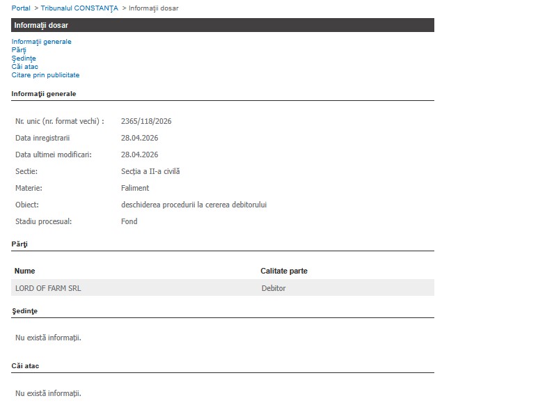 Dosar 2365/118/2026 (Tribunalul Constanța): Obiect - deschiderea procedurii la cererea debitorului (Lord Of Farm SRL). Înregistrat: 28.04.2026.