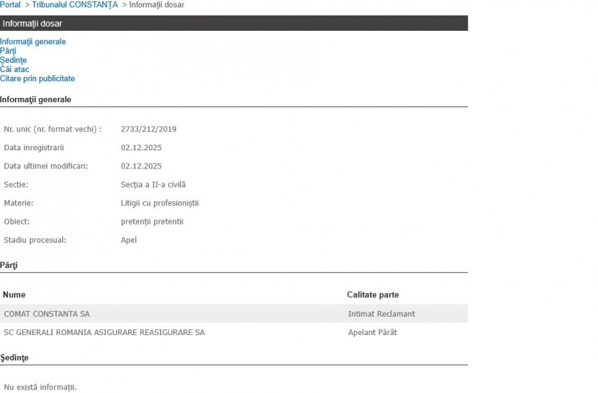 Data declarării căii de atac a fost 14 noiembrie 2025, iar apelul a fost înregistrat la Tribunalul Constanța pe 2 decembrie a.c.