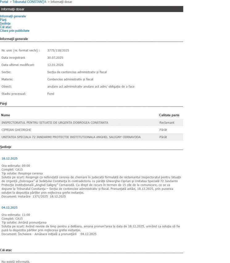 „Solutia pe scurt: Respinge ca nefondată cererea de chemare în judecată formulată de reclamantul Inspectoratul pentru Situaţii de Urgenţă „Dobrogea” al Judeţului Constanţa în contradictoriu cu pârâţii Gheorghe Ciprian şi Unitatea Specială 72 Jandarmi Protecţie Instituţională „Anghel Saligny” Cernavodă. Cu drept de recurs în termen de 15 zile de la comunicare, ce se va depune la Tribunalul Constanţa – Secţia de contencios administrativ şi fiscal. Pronunţată astăzi, 18.12.2025, prin punerea soluţiei la dispoziţia părţilor prin mijlocirea grefei instanţei.