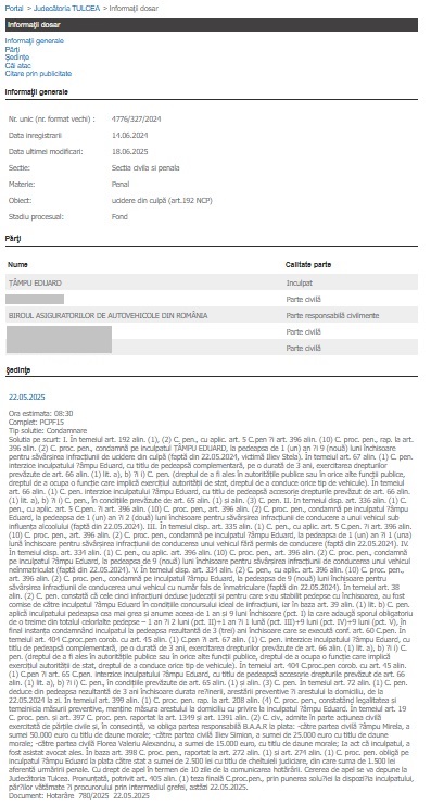 În primă instanță, la data de 22.05.2025, Judecătoria Tulcea l-a condamnat pe inculpat la 3 ani de închisoare și a obligat partea responsabilă civilmente la plata sumei totale de 90.000 de euro către părțile civile, reprezentând daune morale.