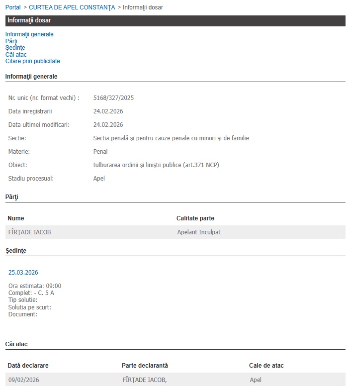 În cauză, este vorba despre Fîrțade Iacob, care a contestat pedeapsa de 1 an și 6 luni la Curtea de Apel Constanța și care a fost citat la instanța superioară la mijlocul lunii martie, anul curent.