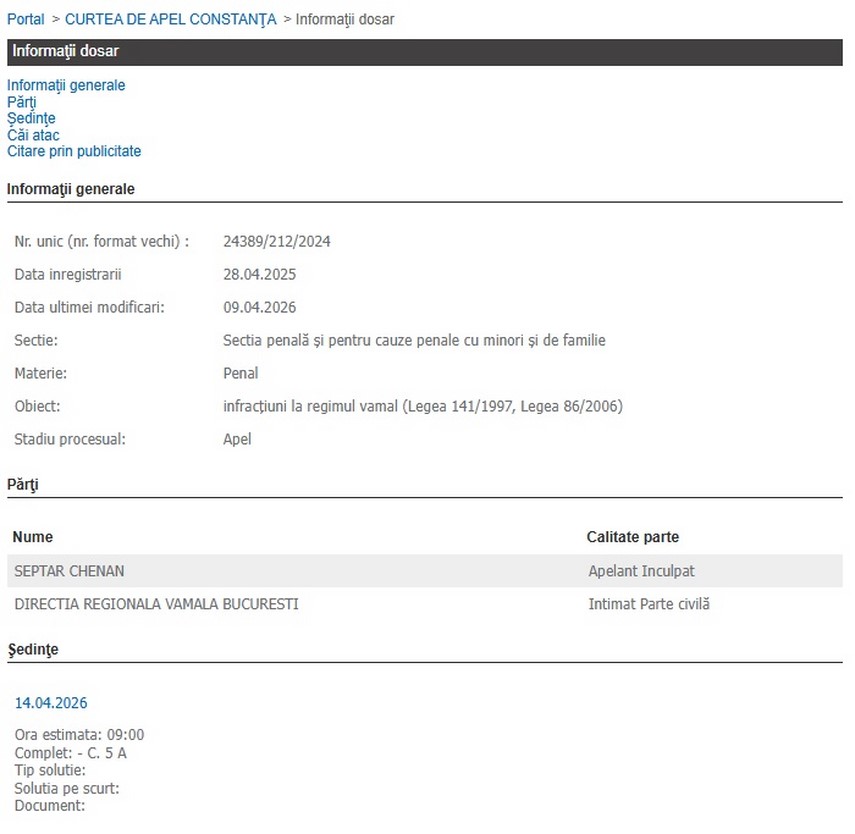 Drept urmare, acesta a fost deferit justiției în dosarul cu indicativul 24389/212/2024, în care Direcția Regională Vamală București figurează ca parte civilă. Dosarul a fost judecat pe fond la Judecătoria Constanță.