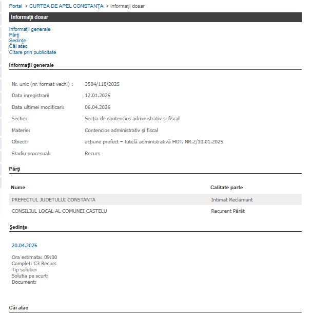 Curtea de Apel Constanța analizează astăzi, 20 aprilie 2026, recursul declarat de Consiliul Local al Comunei Castelu într-un dosar de tutelă administrativă inițiat de Prefectul Județului Constanța. Litigiul vizează anularea unei hotărâri de consiliu (Hotărârea nr. 2 din 10 ianuarie 2025).